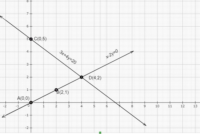 直線 AB 表示方程 $x-2y=0$,直線 CD 表示方程 $3x+4y=20$。