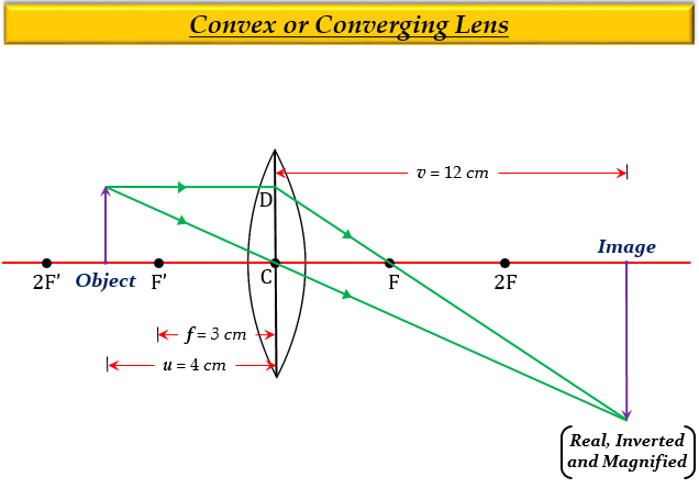 一個物體放在會聚透鏡前4釐米處,在透鏡後12釐米處產生一個實像。(a) 像的放大率是多少?(b) 透鏡的焦距是多少?(c) 畫一個光路圖來顯示像的形成。在圖中清楚地標記F和2F。