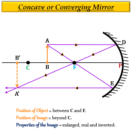 2. 當物體放置在凹面鏡的曲率中心 $(C)$ 和焦點 $(F)$ 之間時,所形成的像是實像、倒立且放大的,如下圖所示。這裡,物體 $AB$ 被放置在凹面鏡的曲率中心 $(C)$ 和焦點 $(F)$ 之間,其像 $A'B'$ 形成在曲率中心的後面,它是實像、倒立且放大的。
