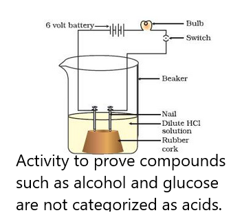 觀察結果:在酸的情況下,燈泡會發光,但在酒精和葡萄糖的情況下,燈泡不會發光,因為電流是由溶液中的離子導電的。