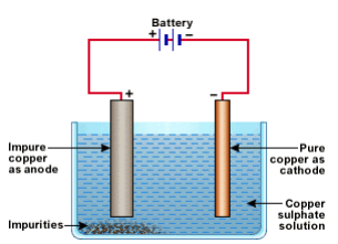 4) 電解精煉反應:將不純的銅金屬製成陽極,將純銅製成陰極,並使用硫酸銅作為電解液。電解液中的純銅沉積在陰極上,可溶性雜質進入溶液,不溶性雜質保留在溶液中並沉積在陽極底部。