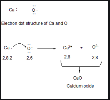 (b) 鈣與氧反應形成離子化合物氧化鈣 (CaO)。鈣的原子序數為 20,氧的原子序數為 8。透過失去兩個電子,鈣原子形成鈣離子 (Ca2+),透過獲得兩個電子,氧原子形成氧化離子 (O2-)。