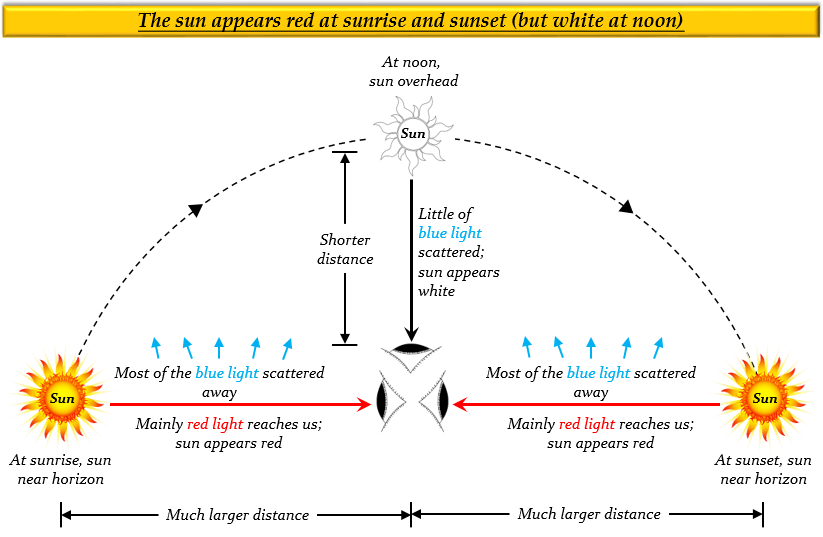 藉助光的散射,解釋太陽在日落/日出和中午時呈現不同顏色的原因。