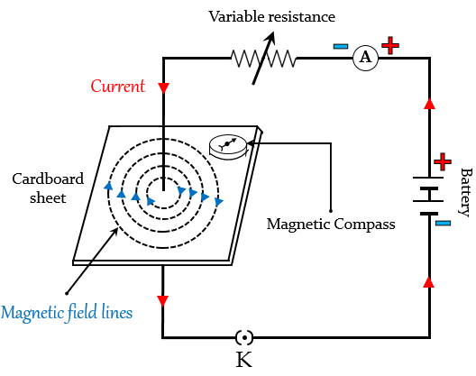 畫出載流直導線垂直穿過水平硬紙板周圍產生的磁場線圖案。說明並應用右手螺旋定則標出磁場線的方向。當確定磁場點的距離載流直導線越來越遠時,磁場強度將如何變化?給出理由來證明你的答案。