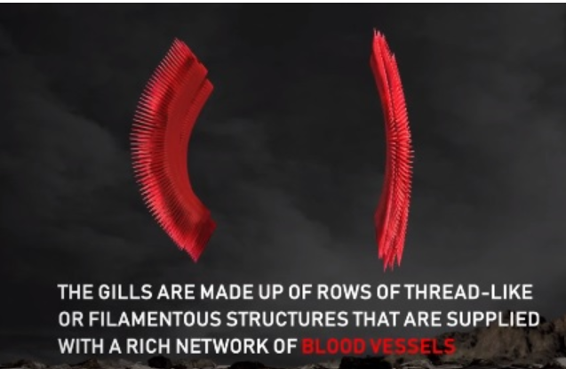 鰓是位於魚頭兩側的分支器官,具有非常細小的血管,稱為毛細血管。魚類透過鰓吸入水中所含的氧氣。]