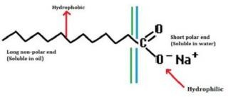 - 肥皂分子的另一端(短的極性端)是羧酸根離子,它是親水的,即溶於水但不溶於油。