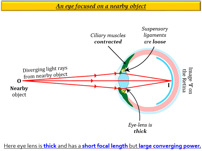 而當光線來自近處物體時,由於睫狀肌使晶狀體鬆弛/放鬆,光線會發生更強的折射(彎曲),導致晶狀體厚度增加(變厚)。