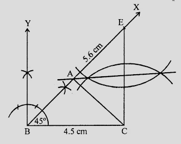 (ii) 在B點,畫一條射線BX,使其與BC形成45°角,並在BX上擷取BE = 5.6釐米,連線CE。