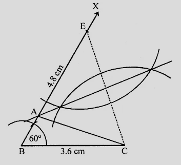 (ii) 在B點,畫一條射線BX,使其與BC成60°角,並在BX上擷取BE = 4.8釐米。