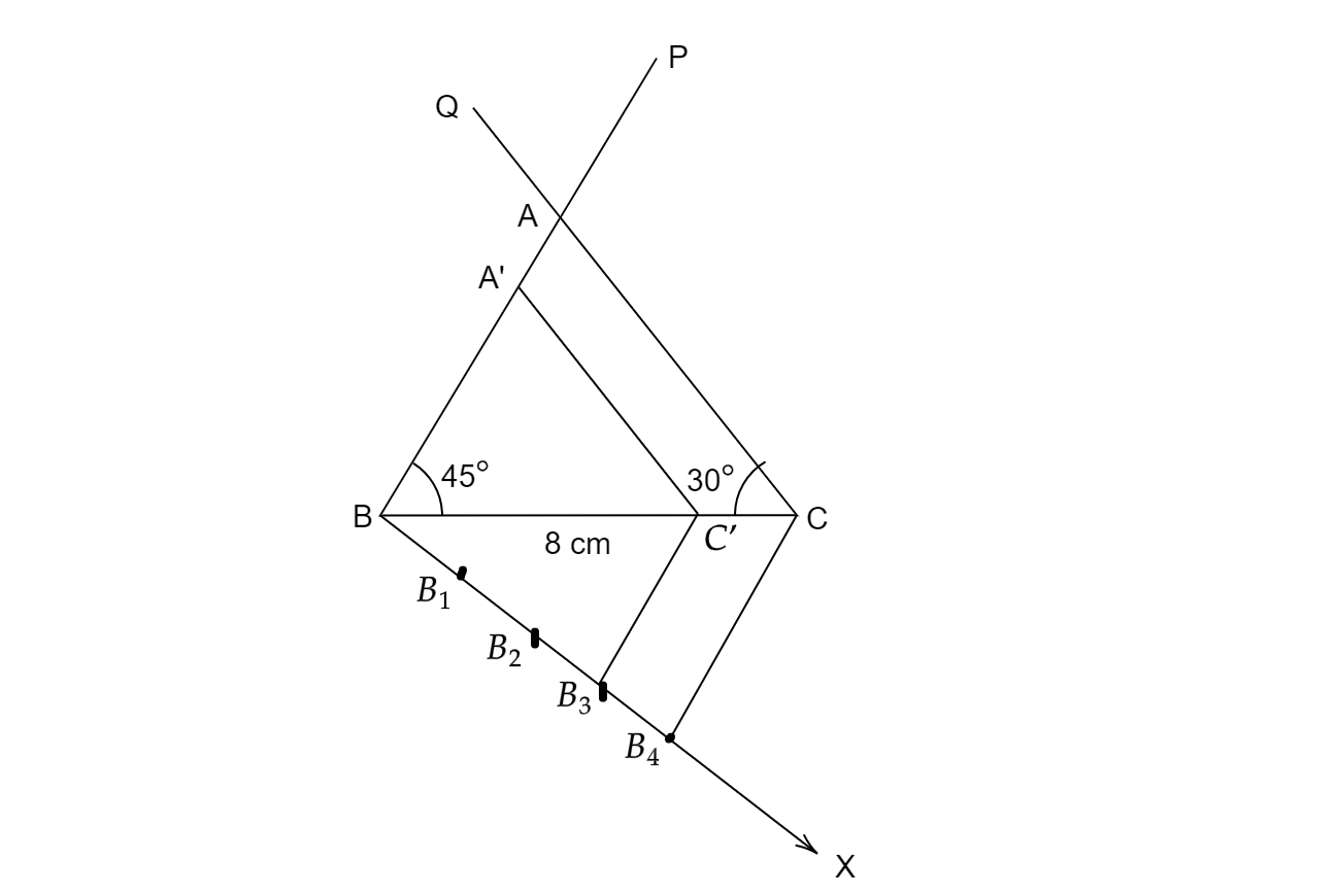 4.從點$B_{3}$畫一條平行於$B_{4} C$的直線,其在$BC$上的端點為$C'$。