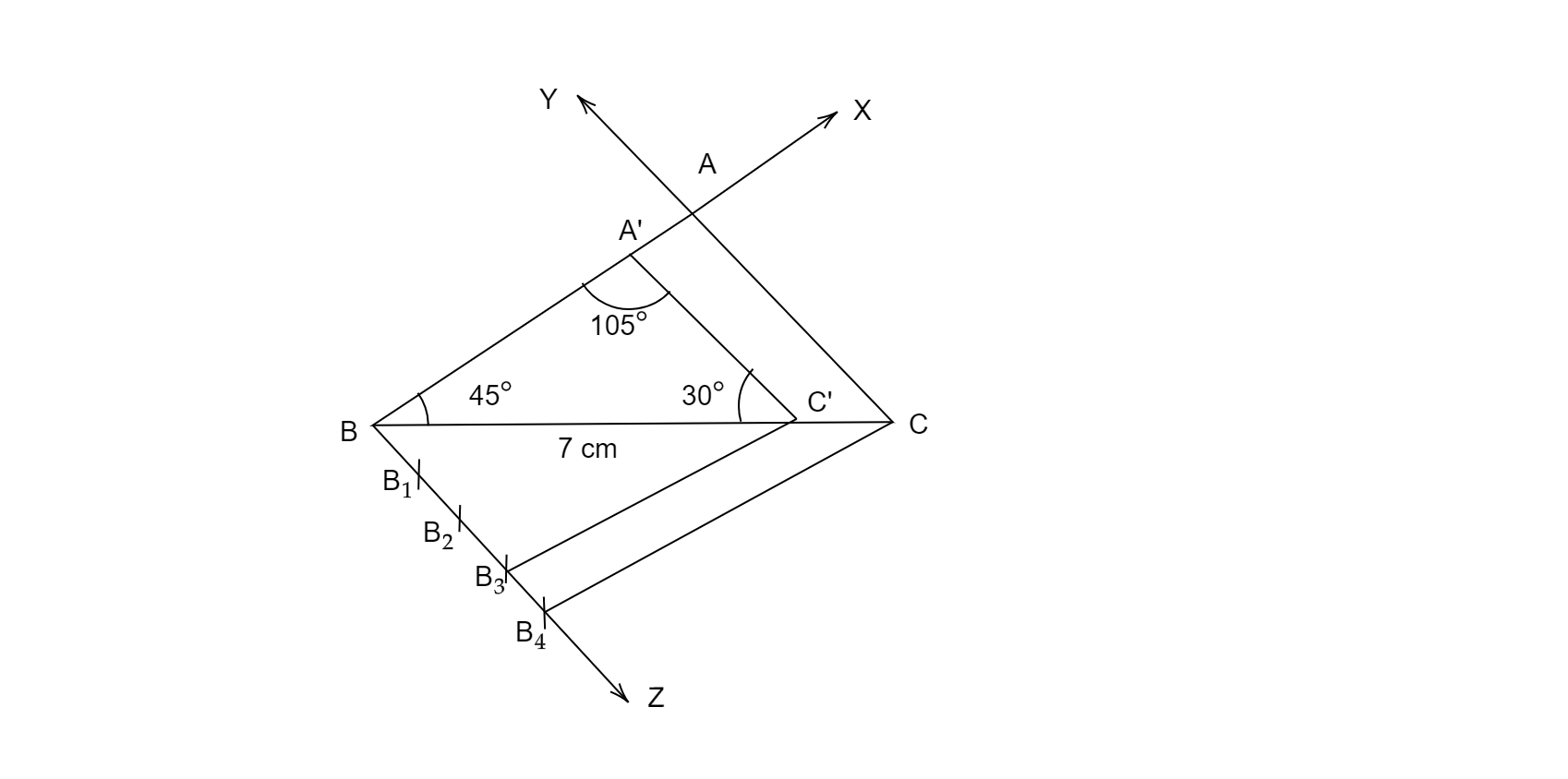 要求:構造一個三角形ABC,其中邊$BC=7\ cm$,$\angle B = 45^{o}$,$\angle A = 105^{o}$,然後構造另一個三角形,其邊長是ABC對應邊的$\frac{3}{4}$倍。