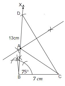 作一個三角形\( \mathrm{ABC} \),其中\( \mathrm{BC}=7 \mathrm{~cm},\angle \mathrm{B}=75^{\circ} \)且\( \mathrm{AB}+\mathrm{AC}=13 \mathrm{~cm} \)。