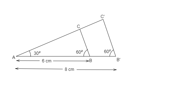 作圖一個△ABC,其中AB = 6釐米,∠A = 30°,∠B = 60°。再作一個與△ABC相似的△AB'C',底邊AB' = 8釐米。