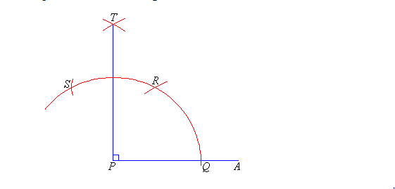 步驟6: 以S點為圓心,半徑為PQ,畫弧交步驟5中畫的弧於T。