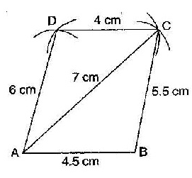 構造四邊形ABCD。AB等於4.5釐米,BC等於5.5釐米,CD等於4釐米,AD等於6釐米,AC等於7釐米。