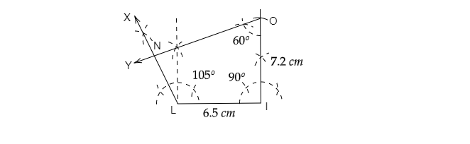 作一個四邊形$LION$,其中$LI=6.5\ cm$,$IO=7.2\ cm$,$\angle I=90^o$,$\angle O = 60^o$ 和 $\angle N=105^o$。