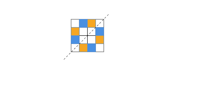 任務:複製此處給出的圖形。取任意一條對角線作為對稱軸,再塗陰影一些方格,使圖形關於該對角線對稱。確定圖形是否會關於兩條對角線都對稱。