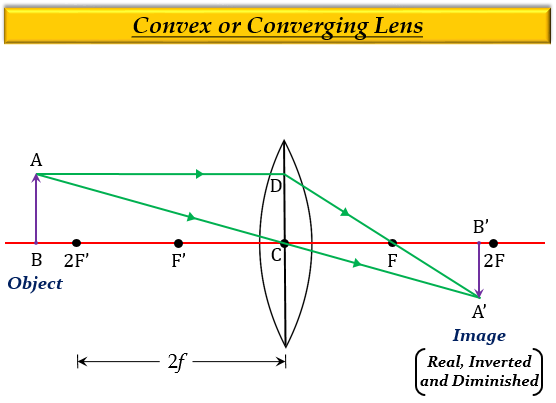 當物體放置在凸透鏡前方2F'之外時,所形成的像是實像、倒立、比物體小(或縮小),並且位於透鏡另一側的f和2f之間。