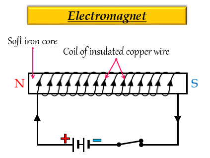 電磁鐵是一種臨時磁鐵,只有通電時才能工作。它的工作原理是基於電流的磁效應。它由繞在軟鐵芯上的長而絕緣的銅線線圈組成,軟鐵芯透過感應磁化,從而在電流流過時充當磁鐵。