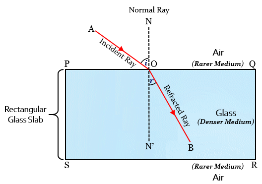 1. 當光線穿過 低折射率的介質,例如 空氣 (快介質或光疏介質)到 高折射率的介質,例如 玻璃(慢介質或光密介質)時,其速度減慢並 向法線彎曲。