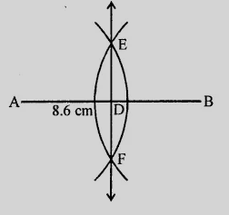 (ii) 以 A 和 B 為圓心,以大於 AB 半長的半徑畫弧,這兩條弧在 AB 的兩側相交於 E 和 F。