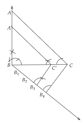 (iii) 連線 $B_4C$,並畫 $B_3C’\ \parallel B_4C$ 和 $C’A’$ 平行於 $CA$。
