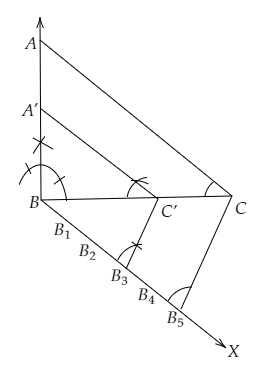 (iii) 連線 $B_4C$,並畫出 $B_3C’\ \parallel\ B_5C$ 和 $C’A’$ 平行於 $CA$。
