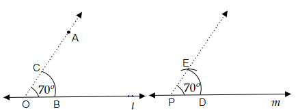 (i) 我們畫一條直線l,並在其上標記一個點O。現在,透過將量角器的中心放在直線l的點O上,我們標記一個70°的點A。