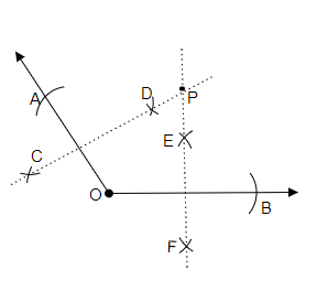 畫一個以 \( O \) 為頂點的任意角。在角的兩條邊上分別取點 \( A \) 和 \( B \),使得 \( \mathrm{OA}=\mathrm{OB} \)。作 \( \overline{\mathrm{OA}} \) 和 \( \overline{\mathrm{OB}} \) 的垂直平分線。設它們交於點 P。那麼 \( \mathrm{PA}=\mathrm{PB} \) 嗎?