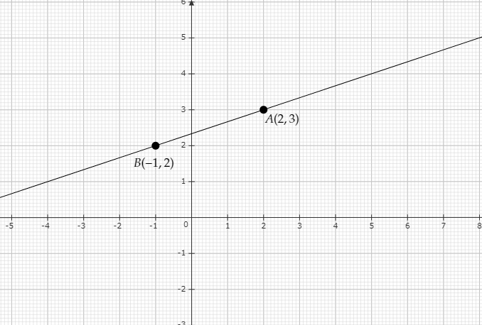 在圖上繪製點 A(2, 3) 和 B(-1, 2),並將它們連線起來,即可得到給定方程的影像。