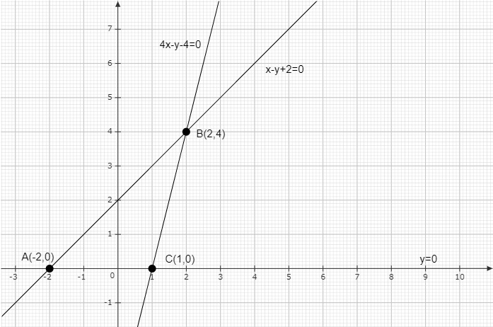 直線AB、CD和AC分別表示方程 $x-y+2=0$、$4x-y-4=0$和x軸。
