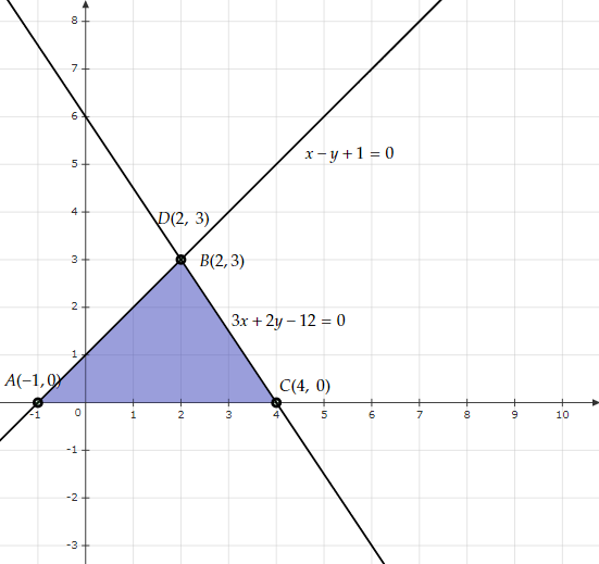繪製直線 $x\ -\ y\ +\ 1\ =\ 0$ 和 $3x\ +\ 2y\ -\ 12\ =\ 0$ 的影像。確定由這兩條直線和 x 軸形成的三角形的頂點座標,並對三角形區域進行陰影。計算這些直線和 x 軸所包圍的面積。