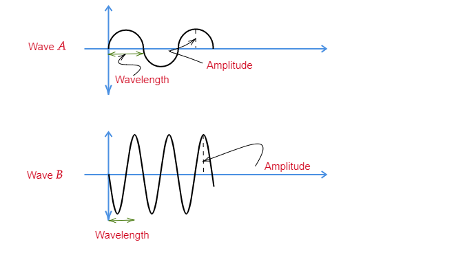 繪製兩條波浪 A 和 B 的草圖,其中波浪 A 的波長是波浪 B 的兩倍,振幅是波浪 B 的一半。
