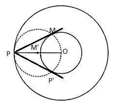 以 M’ 為圓心,OM’ 為半徑畫一個虛線圓,該圓與內圓相交於 M 和 P’。