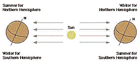6月,北半球是夏季,因為那時太陽光線比其他任何時候都更直接地照射到地球的一部分。12月,北半球是冬季,因為那時輪到南極向太陽傾斜。