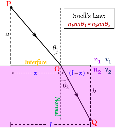 現在我們考慮一條光線從點P傳播到點Q,穿過具有不同折射率的介質,如圖所示。在兩點之間傳播的時間是在每種介質中的距離除以相速度(該介質中光速)。