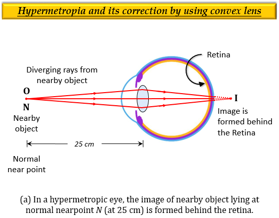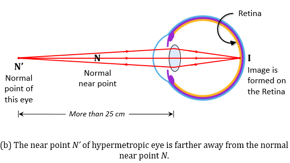 可以使用含有凸透鏡的眼鏡來矯正,該凸透鏡的焦距(或屈光度)應使其在遠視眼的近點'N'處形成位於正常近點N(25釐米)處的物體的虛像。這樣,眼球晶狀體就能輕鬆聚焦來自近點的光線,並在視網膜上形成清晰的物像。