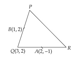 在三角形$PQR$中,過$Q(3,2)$點的兩條邊的中點座標分別為$(2, -1)$和$(1, 2)$。