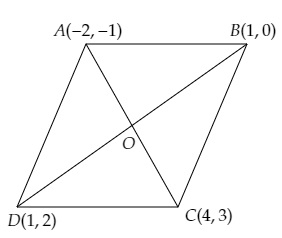 設給定平行四邊形的頂點為$A (-2, -1), B (1, 0), C (4, 3)$和$D (1, 2)$,其中$AC$和$BD$為對角線。