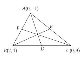 △ABC的頂點座標為A(0, -1), B(2, 1)和C(0, 3)。