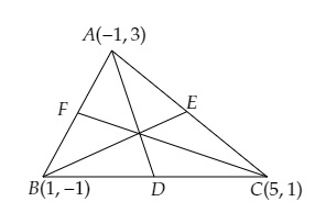 求頂點為A(-1, 3), B(1, -1)和C(5, 1)的三角形的中間線的長度。