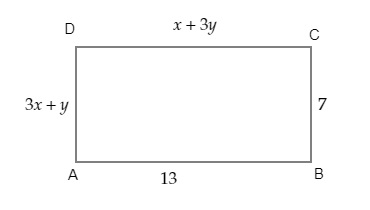 ABCD是一個矩形,其中AB=13, BC=7, CD=x+3y,AD=3x+y。