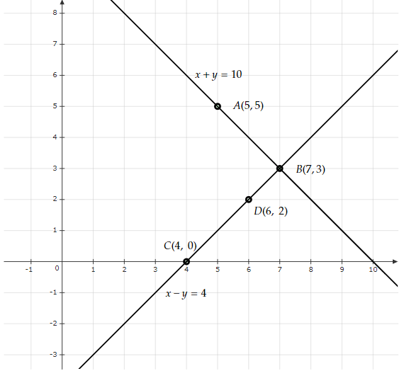 直線 AB 和 CD 分別表示方程 $x+y=10$ 和 $x-y=4$。