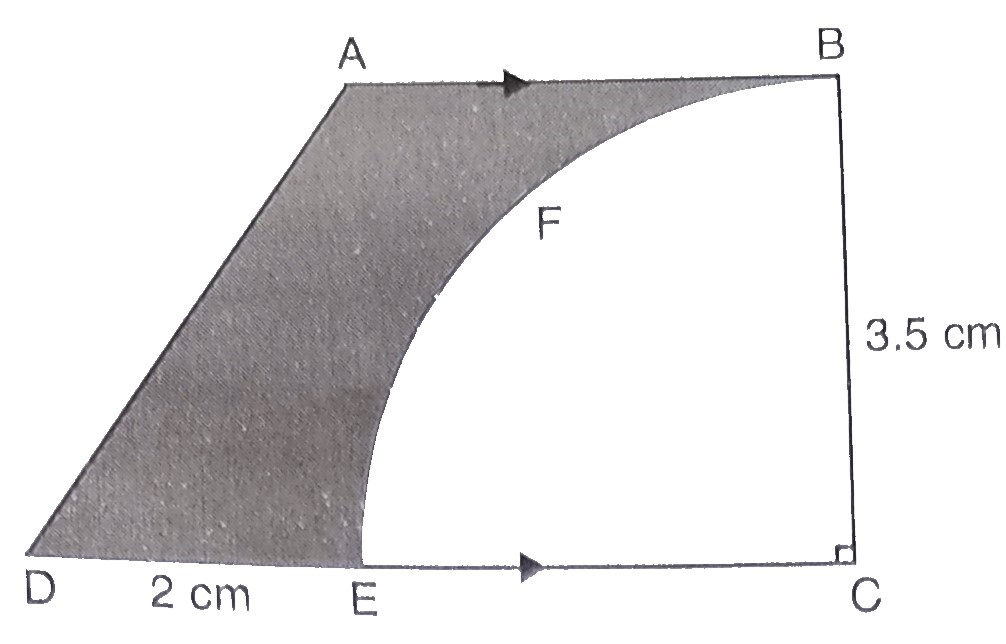 從一塊形狀為梯形(ABCD)的薄金屬片上,其中AB平行於CD且∠BCD=90°,去除四分之一圓BEFC。已知AB=BC=3.5釐米,DE=2釐米,計算剩餘金屬片的面積。