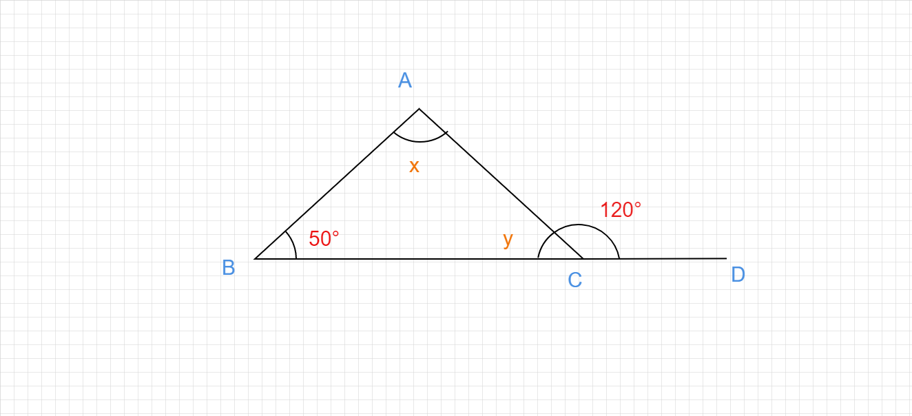 給定一個三角形,其中一個內角為 50°,一個外角為 120°。