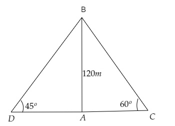 AB = 120 m, ∠BCA = 60°, ∠BDA = 45°