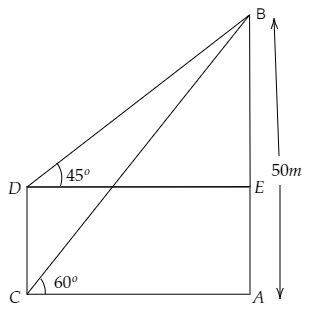 AB = 50 m, ∠BDE = 45°, ∠BCA = 60°
