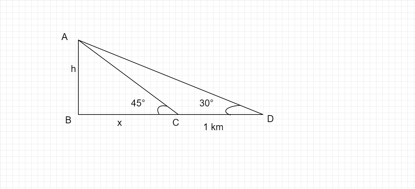 $$\displaystyle tan\ 30\ =\ \frac{h}{x\ +\ 1} \ $$