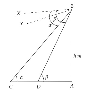 因此,這兩個物體之間的距離為 $h(\cot \alpha-\cot \beta)$。