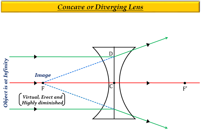 (b) 對於凹透鏡,當物體放置在無窮遠處時,像的位置在焦點 (F) 處,像是虛像,正立,尺寸高度縮小。